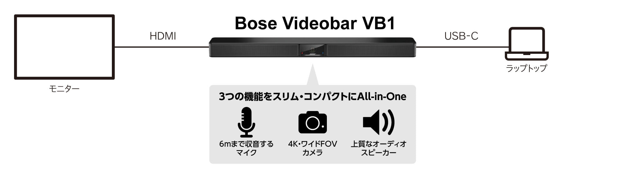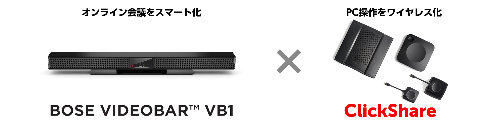 Bose Videobar VB1とClickShareで、複数人いるミーティングルームをつないだオンライン会議が、クリア&シンプルにコミュニケーションできるようになります。
